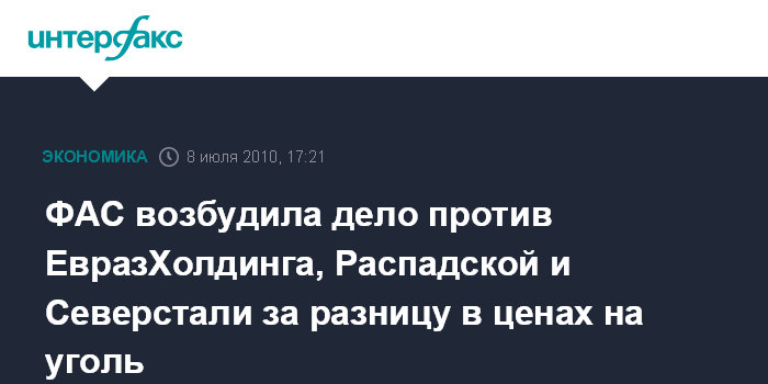 Москва. 8 июля. INTERFAX.RU – Федеральная антимонопольная служба (ФАС) РФ возбудила дело в отношении группы лиц ООО "ЕвразХолдинг", группы лиц ЗАО "Распадская угольная компания" и группы лиц ОАО "Северсталь" по признакам злоупотребления ими доминирующим положением на рынке, говорится в сообщении ФАС.