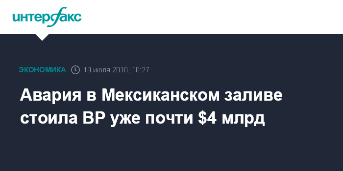 Москва. 19 июля. INTERFAX.RU – Расходы BP Plc на ликвидацию последствий аварии в Мексиканском заливе выросли уже до $3,95 млрд, говорится в опубликованном в понедельник пресс-релизе компании.