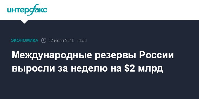 Москва. 22 июля. INTERFAX.RU - Международные резервы России по состоянию на 16 июля составили $469,3 млрд, сообщил департамент внешних и общественных связей Банка России в четверг. По состоянию на 9 июля их объем был равен $467,3 миллиарда. Таким образом, за неделю международные резервы выросли на $2 миллиарда.