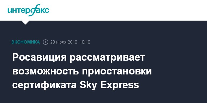 Москва. 23 июля. INTERFAX.RU - Федеральное агентство воздушного транспорта Минтранса России (Росавиция) рассматривает возможность приостановки действия сертификата эксплуатанта ЗАО "Скай экспресс" (Sky Express) из-за многочисленных задержек регулярных и чартерных рейсов, сообщила Росавиция.