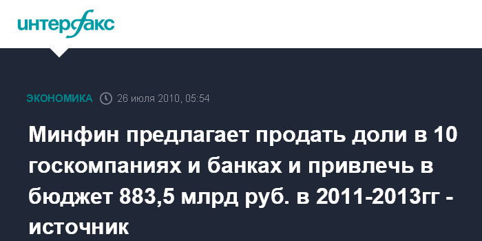 Минфин предлагает продать доли в 10 госкомпаниях и банках и привлечь в бюджет 883,5 млрд руб. в 2011-2013гг - источник