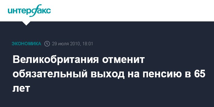 Лондон. 29 июля. INTERFAX.RU - Британское правительство собирается в 2011 году отменить обязательный выход на пенсию лиц, достигших возраста 65 лет, сообщает Daily Telegraph.