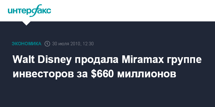 Лос-Анджелес. 30 июля. INTERFAX.RU - Корпорация Walt Disney Co. продает киностудию Miramax группе инвесторов более чем за $660 миллионов. Как ожидается, сделка по продаже Miramax компании Filmyard Holding LLC, принадлежащей группе инвесторов, в которую входят глава Tutor Perini Corp. Рональд Тьютор и инвесткомпания Colony Capital, будет завершена в конце этого года.