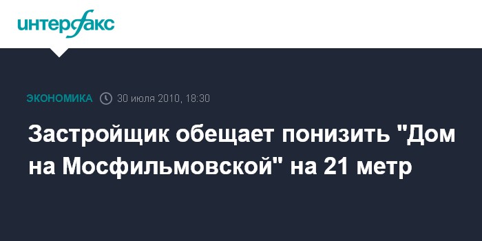 Он не уточнил, сколько этажей будет "срезано". "Дело в том, что это не панель, где высотность спокойно можно измерять этажами. Проект на Мосфильмовской уникален. Пока не известно, за счет каких этажей будет понижена высотность - пентхаусов, технических этажей или каких-либо-других", - отметил собеседник портала.