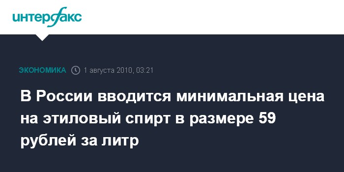 Москва. 1 августа. ИНТЕРФАКС - В России с 1 августа вступает в силу приказ Росалкогольрегулирования от 17 июня 2010 года, в соответствии с которым минимальная цена на этиловый спирт из пищевого сырья составит 59 рублей за 1 литр безводного спирта.