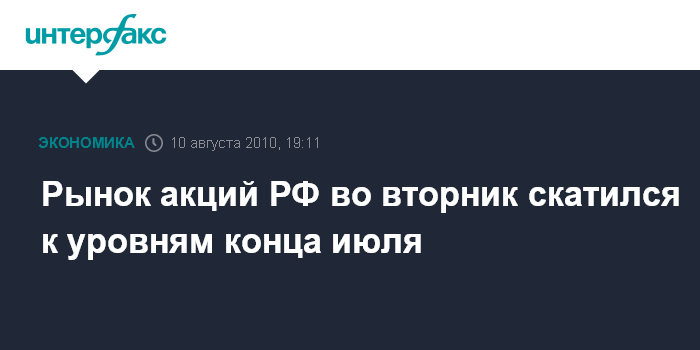 Москва. 10 августа. INTERFAX.RU - Российский рынок акций во вторник скатился к уровням конца июля вслед за мировыми фондовыми площадками и нефтью, негативом для рынков стала слабая статистика из США и сомнения, что по итогам заседания Федеральная резервная система (ФРС) США объявит о новых мерах "количественного смягчения" для поддержки экономики.