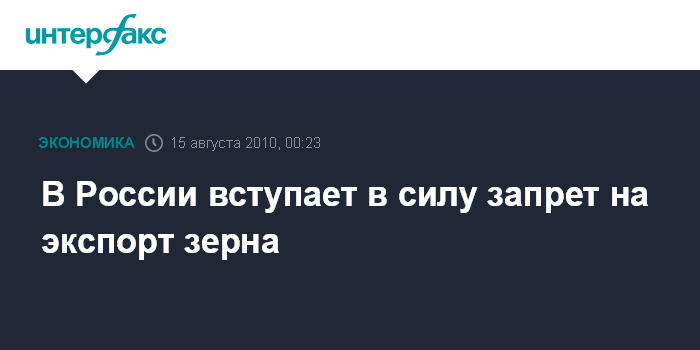Москва. 15 августа. ИНТЕРФАКС - В России с 15 августа вступает в силу запрет на экспорт зерна. В послереформенной стране эта мера применяется впервые.