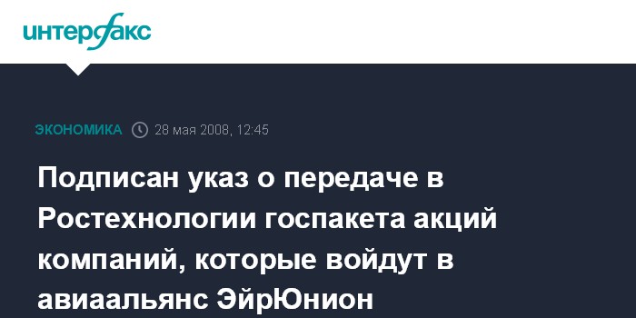 Москва. 28 мая. INTERFAX.RU - Глава Ростехнологий Сергей Чемезов сообщил, что президент РФ подписал указ о передаче в Ростехнологии госпакета акций компаний, которые войдут в объединение ЭйрЮнион - авиационный альянс. "Указ давно обсуждался, и планировалось создание конкурента Аэрофлота. Первоначально считалось, что представлять Эйр-Юнион будет государство, мы предложили свои услуги, и господин Абрамович (Борис Абрамович), глава ЭйрЮнион, Красноярских авиалиний согласился с этим", - сказал Чемезов журналистам.
