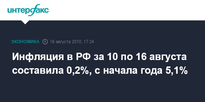 Москва. 18 августа. INTERFAX.RU - Инфляция в РФ за период с 10 по 16 августа составила 0,2%, с начала месяца - 0,4%, с начала года - 5,1%, сообщил в среду Росстат.