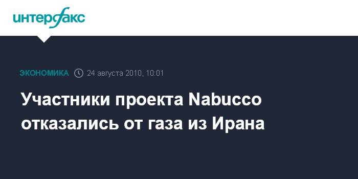 Вена. 24 августа. INTERFAX.RU - Участники проекта по строительству планируемого газопровода Nabucco из стран Каспийского региона в Европу в обход России отказались от поставок газа из Ирана.