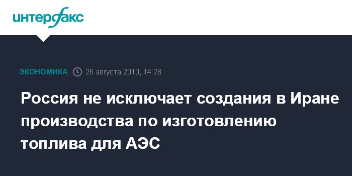 Москва. 26 августа. INTERFAX.RU - Россия не исключает возможности создания в перспективе в Иране производства по изготовлению топлива для АЭС, сообщил "Интерфаксу" осведомленный источник, близкий к переговорам сторон, комментируя заявление иранских властей.