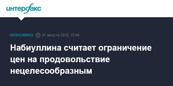 Москва. 31 августа. INTERFAX.RU - Глава Минэкономразвития РФ Эльвира Набиуллина заявила, что считает нецелесообразным вводить ограничения на цены по продовольственным товарам.