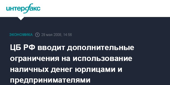 Москва. 29 мая. ИНТЕРФАКС-АФИ - ЦБ РФ вводит ограничение на использование юридическими лицами и индивидуальными предпринимателями наличных средств, полученных от физических лиц в качестве платежей в пользу иных лиц.