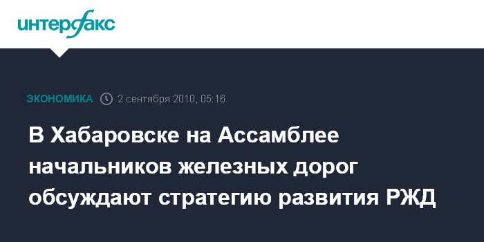Хабаровск. 2 сентября. ИНТЕРФАКС-ДАЛЬНИЙ ВОСТОК - В Хабаровске в четверг под председательством президента ОАО "РЖД" Владимира Якунина открылась VI Ассамблея начальников железных дорог России.