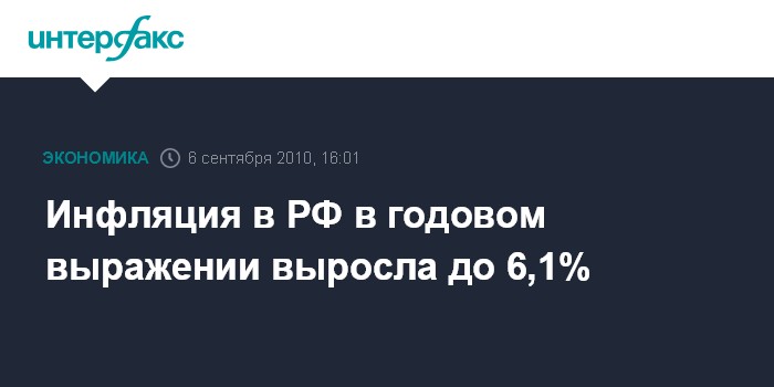Москва. 6 сентября. INTERFAX.RU - Инфляция в РФ в августе 2010 г. составила 0,6% после роста по 0,4% в июле и июне, на 0,5% в мае 2010 г., говорится в сообщении Росстата.