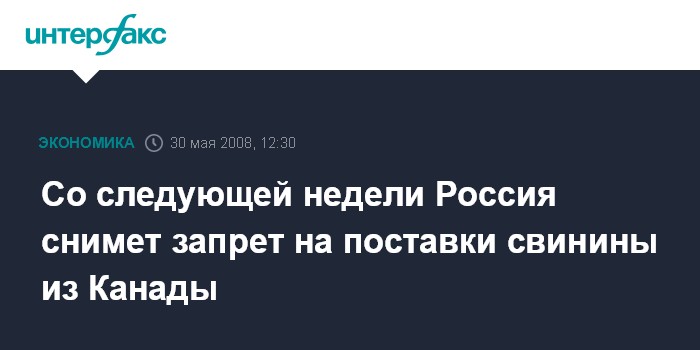 Москва. 30 мая. INTERFAX.RU - Россия со 2 июня этого года снимает запрет на поставки свинины и сырых свиных продуктов из Канады.