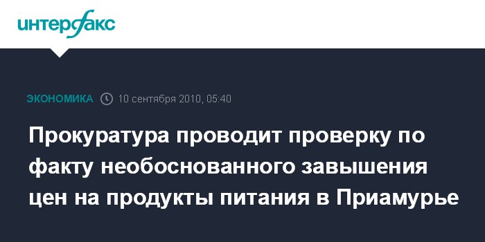 Благовещенск. 10 сентября. ИНТЕРФАКС-ДАЛЬНИЙ ВОСТОК - Прокуратура Амурской области проводит проверку по фактам необоснованного завышения несколькими торговыми организациями цен на продукты питания и продукты зерновых культур.