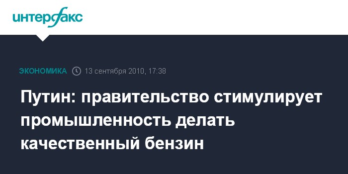 "Принятый правительством технический регламент с будущего года запрещает выпуск бензина, не соответствующего стандарту Евро-3. А в Налоговый кодекс внесены изменения, согласно которым, чем выше качество моторного топлива, тем ниже акцизы на него. То есть мы посылаем нашей промышленности абсолютно понятный и четкий сигнал", - заявил Путин на совещании по развитию нефтехимии.