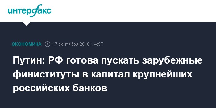 Сочи. 17 сентября. INTERFAX.RU - Россия не возражает против вхождения серьезных финансовых учреждений США и европейских стран в капиталы ведущих российских банков, заявил глава правительства РФ Владимир Путин.