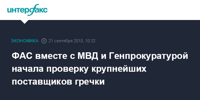 Москва. 21 сентября. INTERFAX.RU - Федеральная антимонопольная служба РФ совместно с ДЭБ МВД и Генпрокуратурой 16 сентября начала "внезапную" проверку трех предприятий - крупнейших поставщиков гречки, говорится в сообщении ФАС.