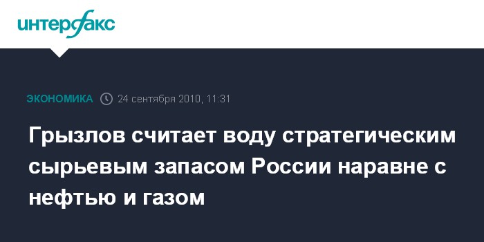 Москва. 24 сентября. INTERFAX.RU - Вода может стать третьим сырьевым ресурсом России после нефти и газа, считает председатель Госдумы РФ Борис Грызлов.
