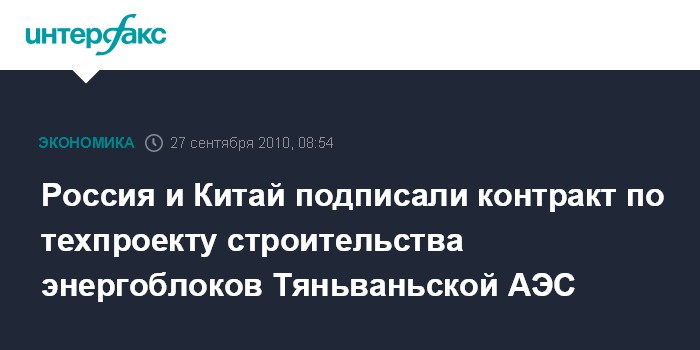 Пекин. 27 сентября. INTERFAX.RU - Президент закрытого акционерного общества "Атомстройэкспорт" Дан Беленький и генеральный директор Цзянсуской ядерной энергетической корпорации Цзян Гоюань подписали в понедельник в Пекине контракт на технический проект сооружения третьего и четвертого блоков Тяньваньской АЭС.
