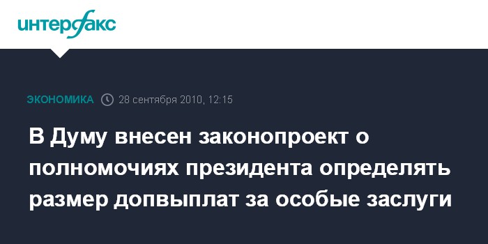 Москва. 28 сентября. INTERFAX.RU - Правительство РФ внесло в Госдуму законопроект о полномочиях президента РФ определять размер дополнительных выплат гражданам за особые заслуги перед Россией. Информация об этом содержится в электронной базе документов нижней палаты парламента.