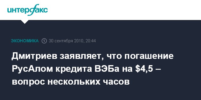 Москва. 30 сентября. INTERFAX.RU - "РусАл" в ближайшее время погасит кредит, привлеченный у Внешэкономбанка осенью 2008 года, на $4,5 млрд, сообщил журналистам глава ВЭБа Владимир Дмитриев.
