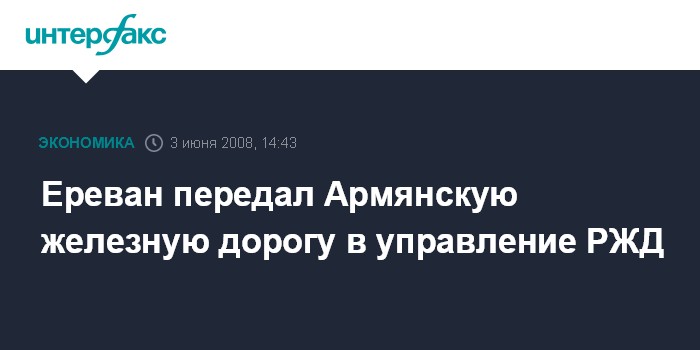 Москва. 3 июня. INTERFAX.RU - Армения с 1 июня 2008 года передала имущественный комплекс Армянской железной дороги в концессионное управление ОАО "Российские железные дороги" (РЖД). Об этом сегодня сообщил министр транспорта и связи республики Гурген Саркисян на пресс-конференции.