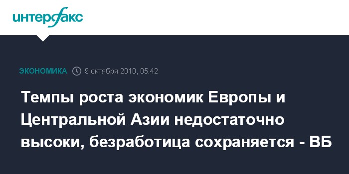 Вашингтон. 9 октября. ИНТЕРФАКС-АФИ - Темпы роста экономик стран Восточной Европы и Центральной Азии недостаточно высоки, в то время как уровень безработицы сохраняется, сообщил вице-президент по региону Европы и Центральной Азии Филипп Ле У‘Эру журналистам на брифинге в Вашингтоне, где в эти дни проходит осенняя сессия Международного валютного фонда (МВФ) и Всемирного банка.