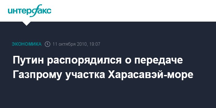 Новый Уренгой. 11 октября. INTERFAX.RU - Премьер-министр РФ Владимир Путин в понедельник распорядился предоставить ОАО "Газпром" участок Харасавэй-море на шельфе Карского моря, сообщил журналистам вице-премьер РФ Игорь Сечин после совещания по генсхеме развития газовой отрасли до 2030 года в понедельник в Новом Уренгое.