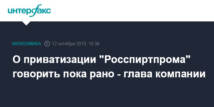 Москва. 12 октября. ИНТЕРФАКС - Генеральный директор ОАО "Росспиртпром" Владимир Иванов считает, что пока рано говорить о приватизации этой государственной компании.