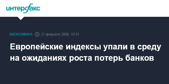 Лондон. 21 февраля. INTERFAX.RU - Европейские фондовые индексы упали в среду впервые за три дня на ожиданиях роста потерь финансовых компаний от инвестиций в кредитную сферу, сообщило агентство Bloomberg.