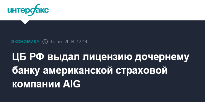 ЦБ РФ выдал лицензию дочернему банку американской страховой компании AIG