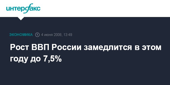 Москва. 4 июня. ИНТЕРФАКС-АФИ - Рост ВВП России замедлится в этом году до 7,5% с 8,1% в 2007 г., сообщается в докладе Организации экономического сотрудничества и развития (ОЭСР).