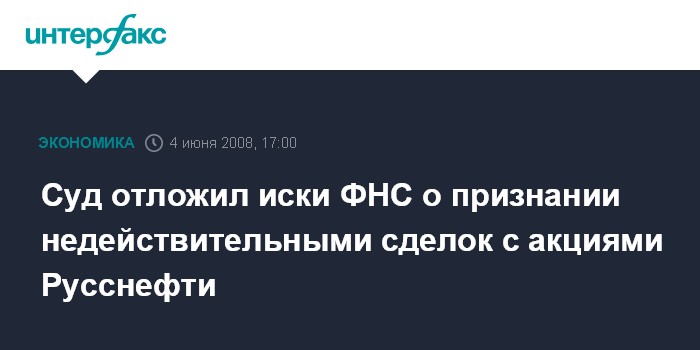 Москва. 4 июня. INTERFAX.RU - Арбитражный суд Москвы сегодня отложил на 6 августа иск Федеральной налоговой службы (ФНС) РФ о признании недействительными сделок с акциями НК "Русснефть", сообщил корреспондент агентства "Интерфакс-АФИ" из суда.