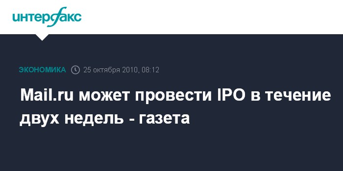 Лондон. 25 октября. INTERFAX.RU - Российская интернет-компания Mail.ru может пройти листинг в Лондоне в течение двух недель, ее оценка в ходе IPO составит до $5 млрд, сообщила в воскресенье лондонская The Sunday Times.