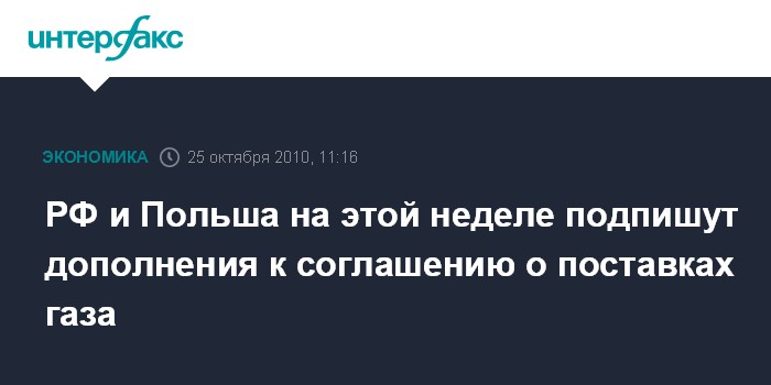 Москва. 25 октября. INTERFAX.RU - Россия и Польша в течение этой недели планируют подписать дополнения к соглашению об увеличении поставок газа в Польшу, сообщил журналистам заместитель министра энергетики РФ Анатолий Яновский.