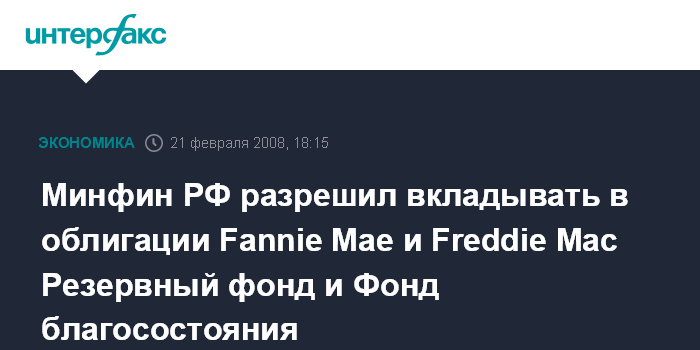 Москва. 21 февраля. INTERFAX.RU - Минфин РФ разрешил вкладывать средства Резервного фонда и Фонда национального благосостояния в долговые обязательства 15 иностранных государственных агентств, в том числе американских ипотечных госкомпаний Fannie Mae и Freddie Mac.