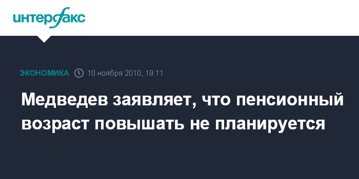 Москва. 10 ноября. INTERFAX.RU - Возраст выхода на пенсию в России в ближайшие годы повышаться не будет, заявил президент РФ Дмитрий Медведев.
