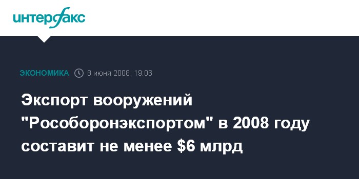 Санкт-Петербург. 8 июня. ИНТЕРФАКС - Экспорт вооружений ФГУП "Рособоронэкспорт" в 2008 году составит не менее $6 млрд, сообщил заместитель главы госкорпорации "Ростехнологии", в которую входит ФГУП, Алексей Алешин журналистам в воскресенье в Санкт-Петербурге.