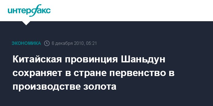 Пекин. 6 декабря. ИНТЕРФАКС-КИТАЙ - В 2010 году производство золота в восточной китайской провинции Шаньдун, как прогнозируется, достигнет 55 тонн, сообщили местные СМИ.