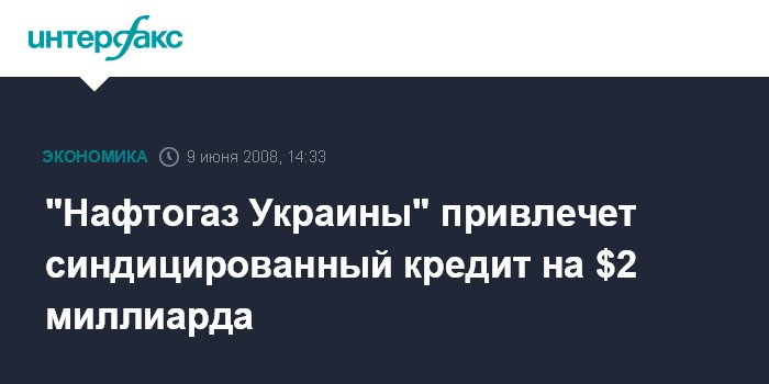 Москва. 9 июня. ИНТЕРФАКС-АФИ - НАК "Нафтогаз Украины" планирует привлечь синдицированный кредит на сумму $2 млрд, сообщил агентству "Интерфакс-АФИ" источник в банковских кругах. Деталей готовящейся сделки собеседник агентства не раскрыл.