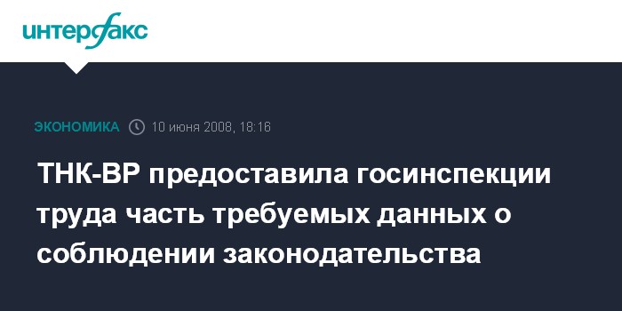 Москва. 10 июня. INTERFAX.RU - ТНК-ВР во вторник предоставила Государственной инспекции труда Москвы часть информации, требуемой ведомством в рамках внеплановой проверки соблюдения трудового законодательства в компании, сообщил Агентству нефтяной информации (АНИ) представитель инспекции.