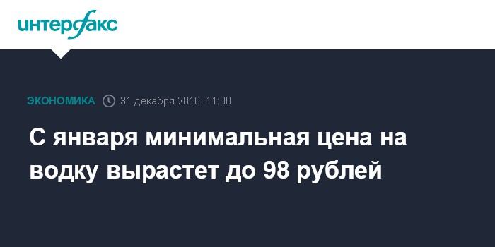 Москва. 31 декабря. INTERFAX.RU - В России с 1 января 2011 года минимальная розничная цена на водку должна быть не ниже 98 рублей за 0,5 литра. Это предусмотрено приказом Росалкогольрегулирования.