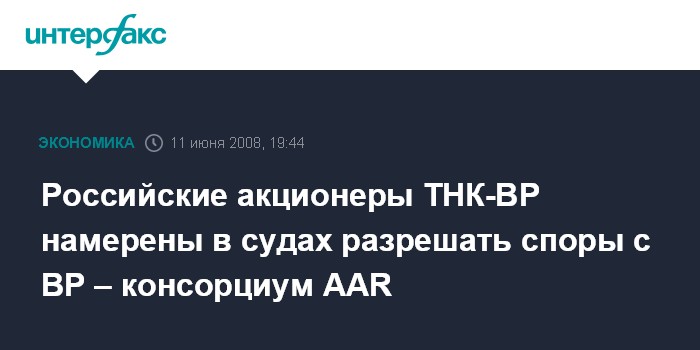 Москва. 11 июня. ИНТЕРФАКС-АНИ - Российские акционеры ТНК-ВР - консорциум "Альфа-групп", Access и Renova (AAR) - намерены в судах разрешать споры с британской ВР, касающиеся корпоративного управления ТНК-BP, сообщил Агентству нефтяной информации представитель AAR Стэн Половец.