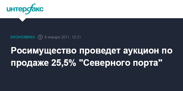 Москва. 9 января. INTERFAX.RU - Росимущество 17 февраля 2011 года проведет открытый аукцион по продаже 25,5% акций ОАО "Северный порт" (Москва), следует из материалов федерального агентства. Начальная цена госпакета "Северного порта" составляет 83,175 млн рублей. Шаг аукциона - 1 млн рублей. Заявки принимаются до 10 февраля