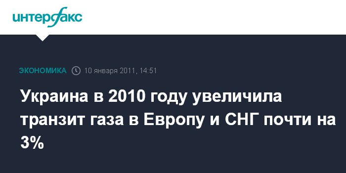 Киев. 10 января. INTERFAX.RU - Транзит природного газа по территории Украины в страны СНГ и Европы в 2010 году составил 98 млрд 602,49 млн куб. м, что на 2,9% (на 2 млрд 777,41 млн куб. м) больше, чем в 2009 году. Как сообщила в понедельник пресс-служба "Укртрансгаза", дочерней компании НАК "Нафтогаз Украины", транзит газа в Западную Европу за прошлый год увеличился на 2,8% (на 2 млрд 580,60 млн куб. м.) - до 95 млрд 426,27 млн куб. м, в страны СНГ - на 6,6% (на 196,81 млн куб. м), до 3 млрд 176,22 млн куб. м.