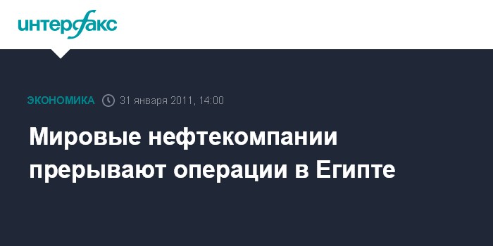 Каир. 31 января. INTERFAX.RU - Беспорядки в Египте заставили ряд крупнейших нефтяных компаний мира, работающих в этой стране, прервать свои операции, сообщило агентство Bloomberg.