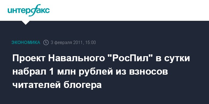 Москва. 3 февраля. INTERFAX.RU – Блогер Алексей Навальный опубликовал в своем ЖЖ первые результаты сбора денег для финансирования сайта РосПил.